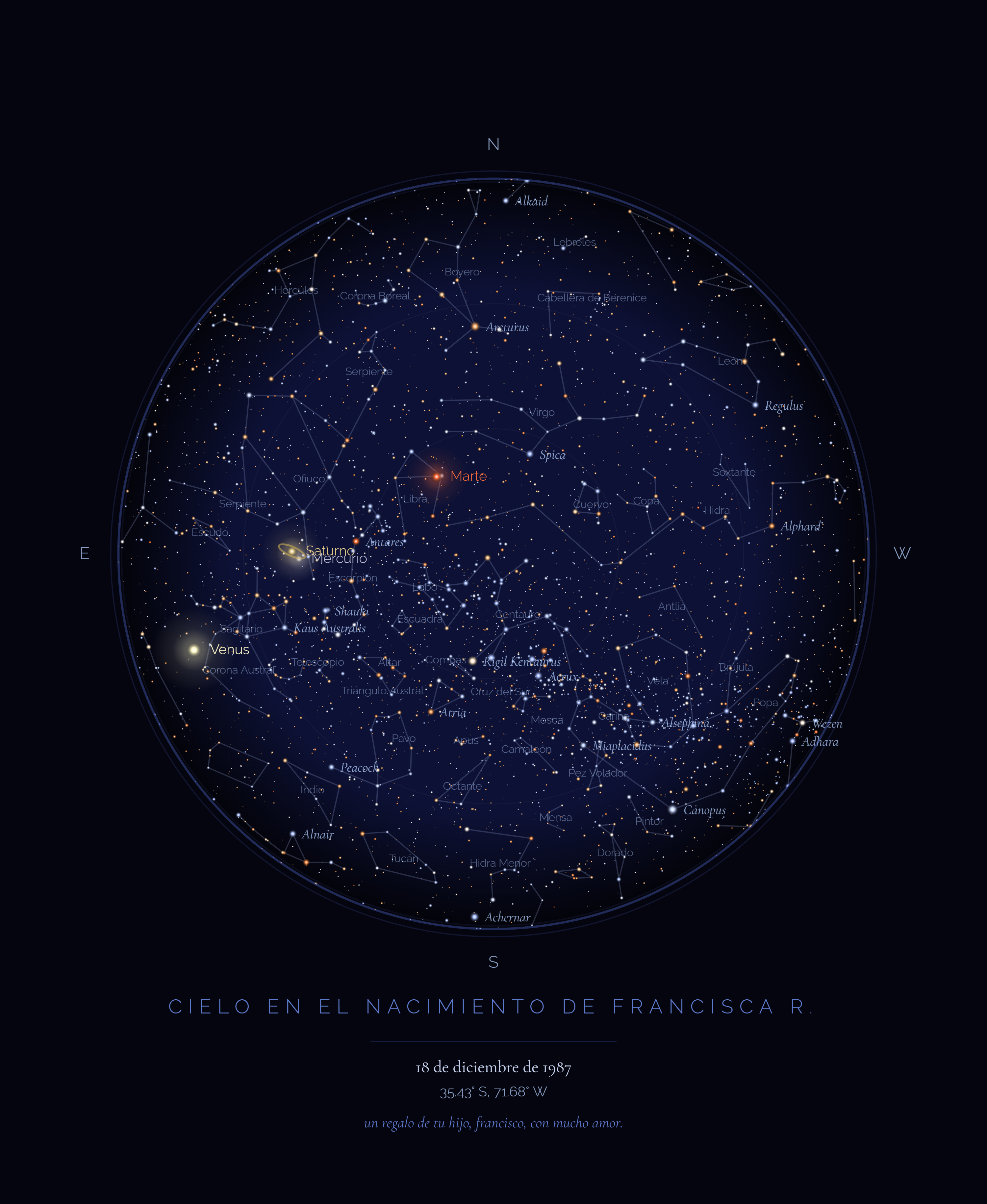 Este mapa fue generado con StarMap usando astronomía real. Muestra el cielo exacto del 18 de diciembre de 1987 desde Talca, Chile — con planetas, constelaciones y nombres de estrellas.